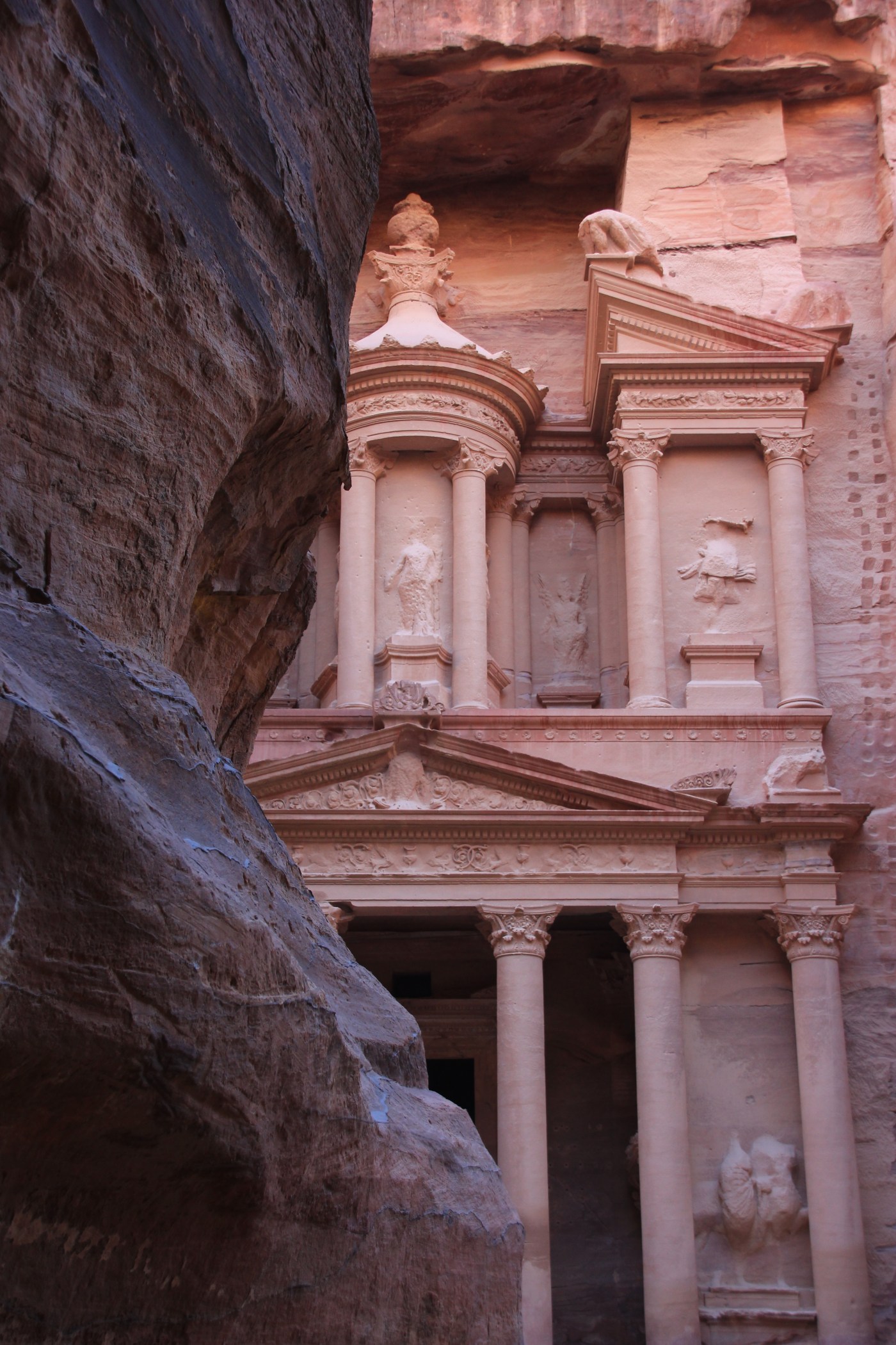 Percorriamo nuovamente il Siq che la sera prima era illuminato dalle candele. Ora non ci sono più e la luce delle prime ore del giorno filtra difficilmente tra le alte pareti rocciose.